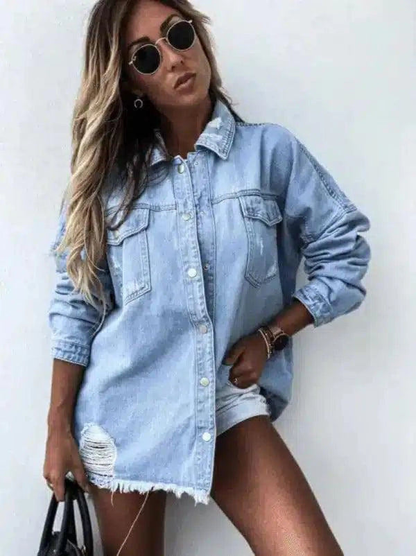 - Fitur Tambahan: Dua saku dada dengan penutup kancing; detail tertekan pada keliman