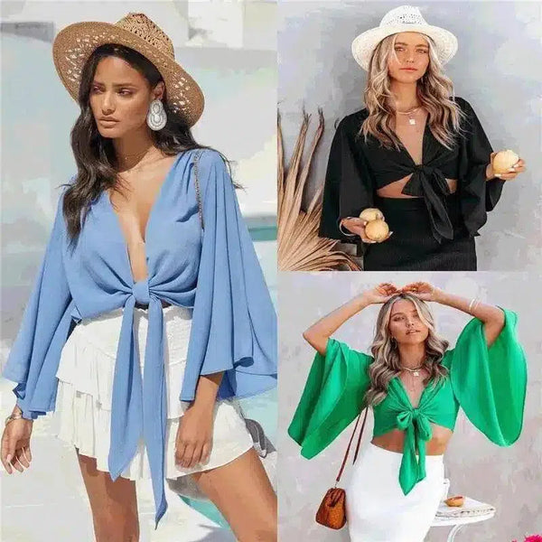 Atasan Crop Top Dasi Depan Wanita dengan Lengan Lebar