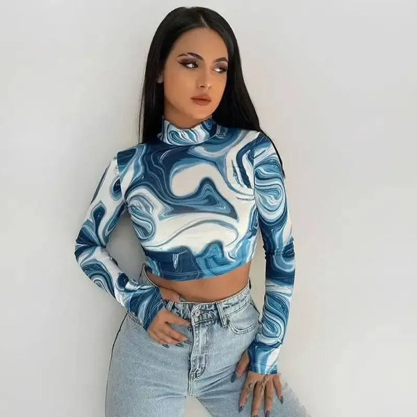 Atasan Lengan Lengan Setengah Turtleneck Pullover Pangkas Jari yang Dicetak