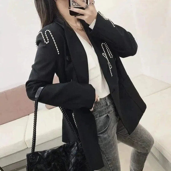 - Pernyataan Mode yang Berani: Buatlah pernyataan yang berani dengan warna hitam yang mencolok dan detail mutiara yang kontras pada blazer ini, yang pasti akan terlihat menonjol dalam segala suasana.