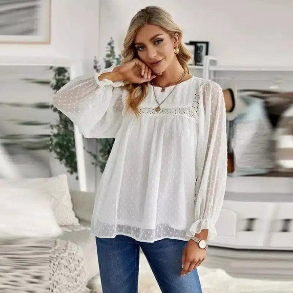 Blus Wanita Lengan Panjang Sheer dengan Detail Renda