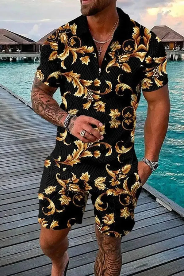 Deskripsi Produk: Setelan Dua Bagian Kerah Ritsleting Kerah Cetak Mode Pria