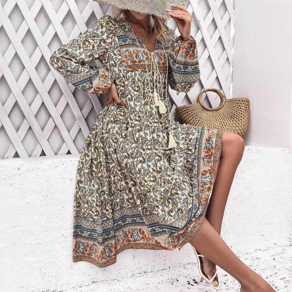 Busana Wanita Liburan Santai Lengan Panjang Maxi Motif Lengan Panjang