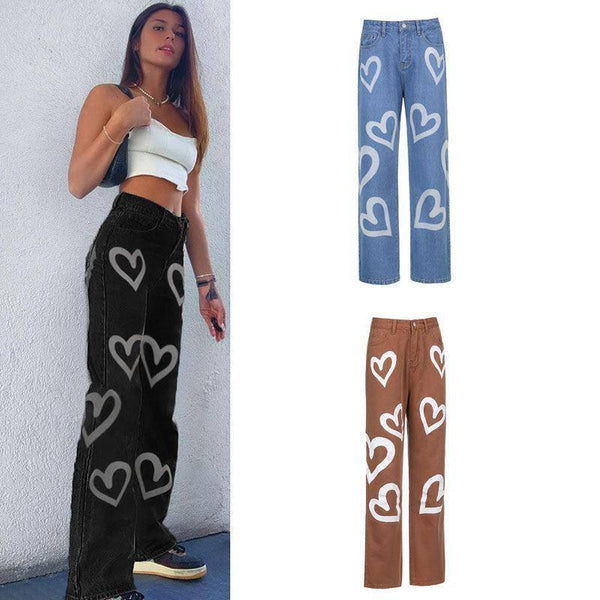 Jeans Kaki Lebar Wanita Love Print Lurus Longgar Biru Muda / 2XL