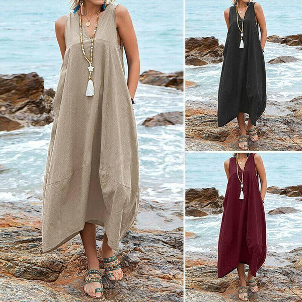 Gaun Kasual Saku Leher V-leher Katun dan Linen Wanita