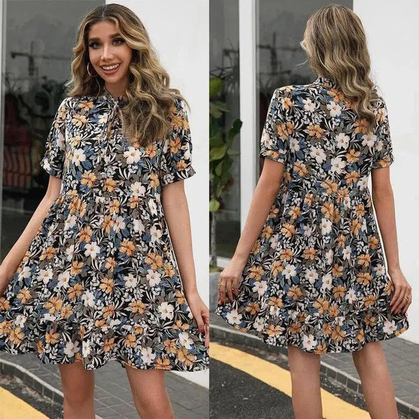 Gaun Lengan Pendek Kerah Berdiri Ruffle Bunga Kecil
