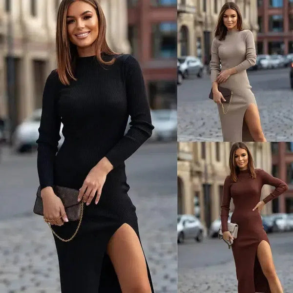 Gaun Musim Gugur Dan Musim Dingin Leher Bulat Warna Solid Ramping