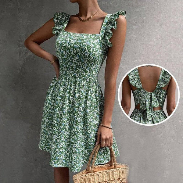 Gaun Tanpa Lengan Leher Kotak Leher Musim Panas Berkerut Dengan Dasi Kupu-Kupu