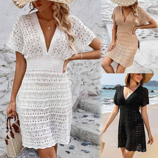 Gaun Pantai Leher V-dalam dengan Pola Gelombang Berlubang