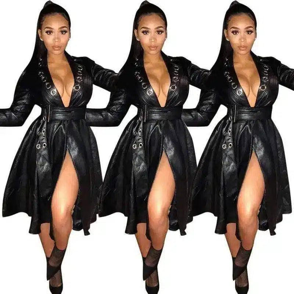 Gaun Parit Kulit Imitasi Wanita dengan Ikat Pinggang
