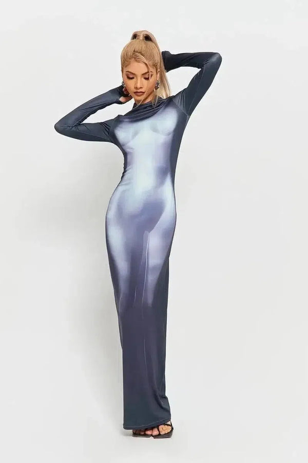 Gaun Pesta Jubah Tubuh Lengan Panjang Lengan Panjang Pencetakan Tubuh 3D