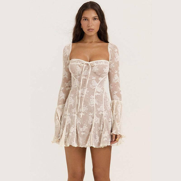 Gaun Kerah Persegi Renda Lonceng Lengan Panjang Terikat Gaun A- Line Pakaian Wanita