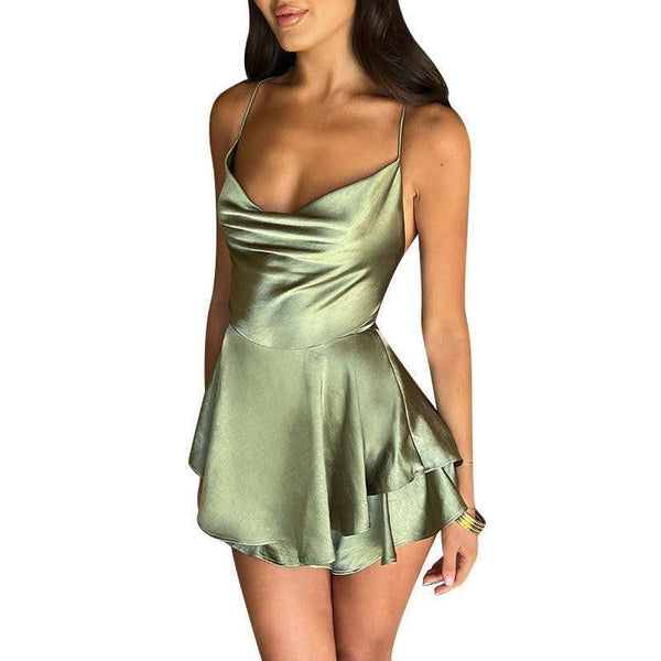 Gaun A-line dengan tali backless berbahan satin suspender yang ramping dan pas di badan