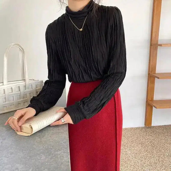 Atasan Lengan Panjang Turtleneck Berlipit Wanita