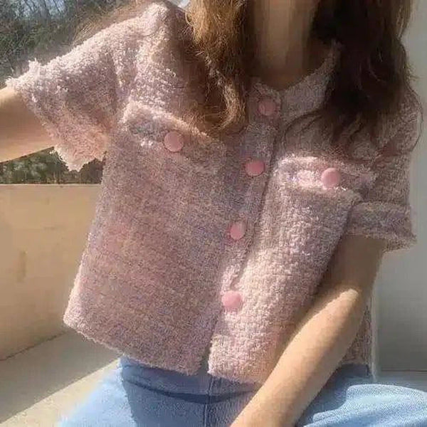 - Detail Desain: Dilengkapi dengan dua saku dada dan kancing berwarna merah muda yang ceria
