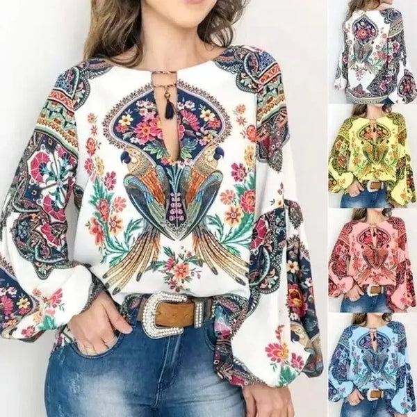 Kemeja Lengan Lentera Leher Bulat Cetak yang Dipersonalisasi