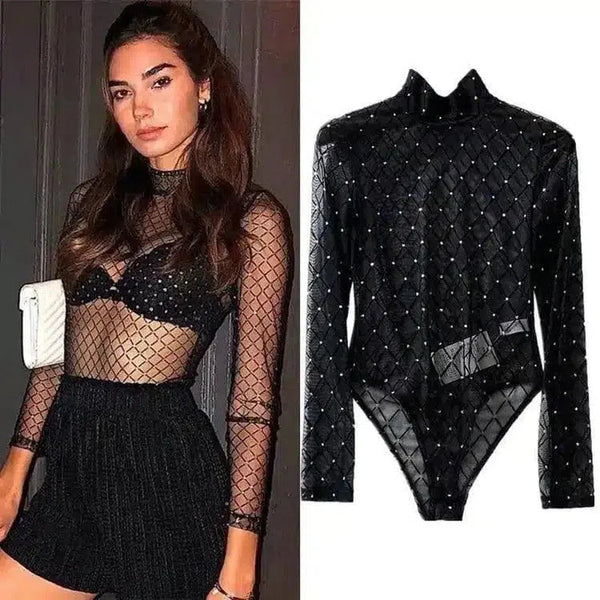 Bodysuit Jaring Berhias dengan Lengan Panjang