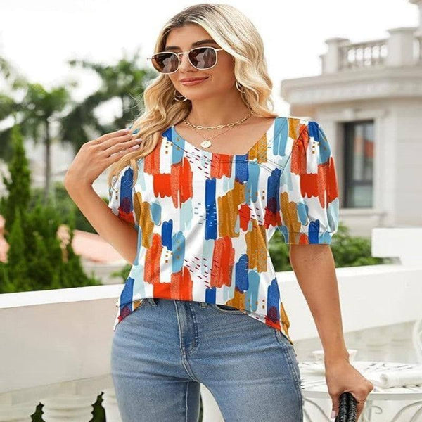 Wanita Lengan Pendek Tidak Beraturan Lengan Puff Longgar Motif Bunga