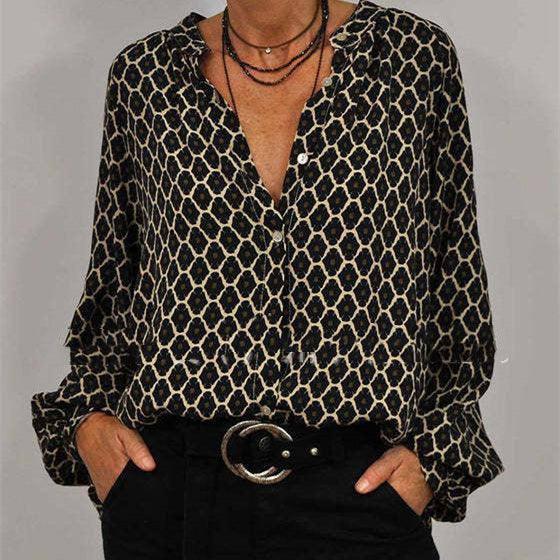 Kemeja Kaos Cetak Mode Musim Semi Leher V Leher Panjang Wanita