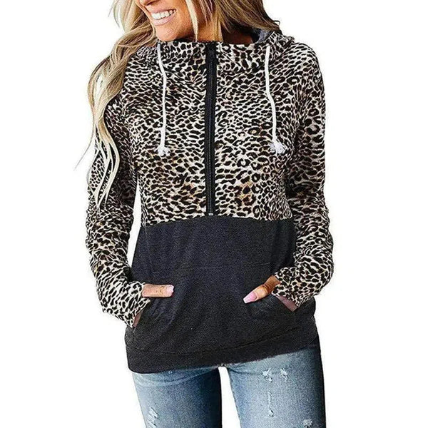 Kaus Berkerudung Motif Macan Tutul Wanita dengan Saku