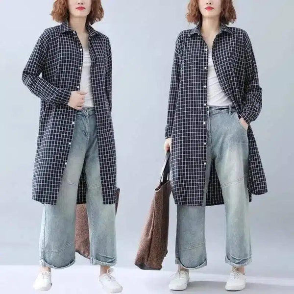 Kemeja Lengan Panjang Longgar dan Ramping Kotak-kotak