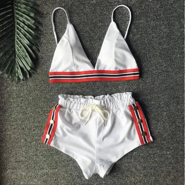 - Desain: Set bikini tiga potong yang menampilkan gaya baju renang terbelah