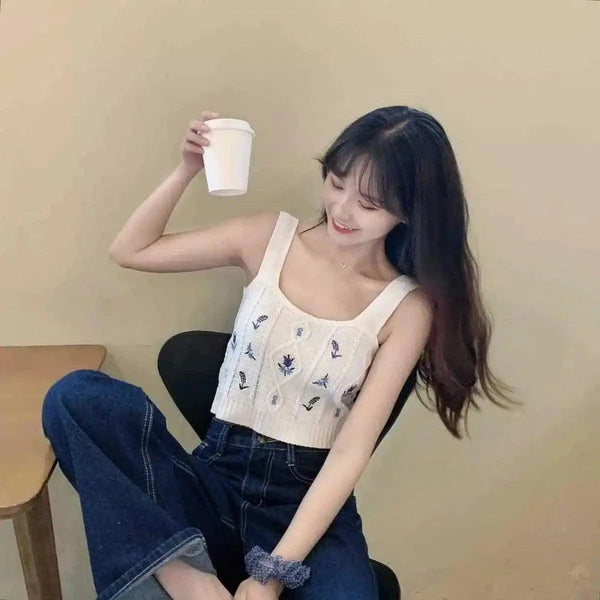 Pakaian Kasual Tanpa Lengan Atasan Pucuk Bunga Rajut