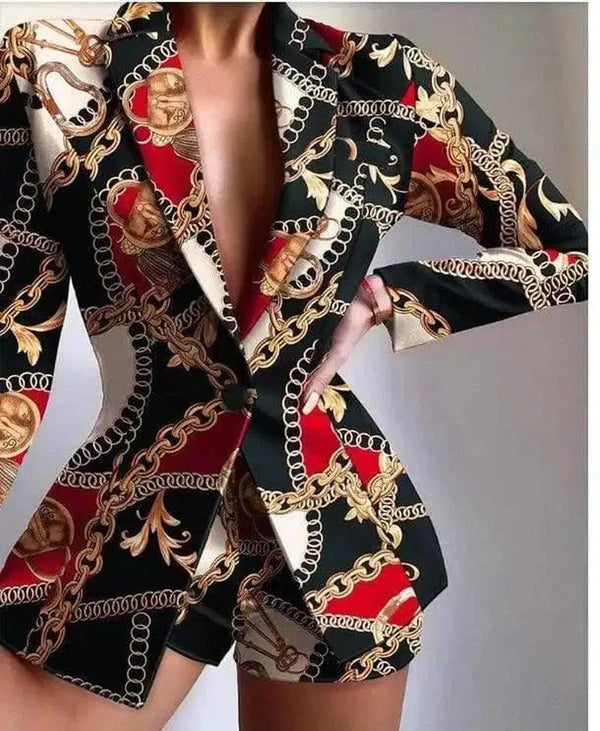 - Jenis Pakaian: Blazer bergaya dengan celana pendek yang serasi