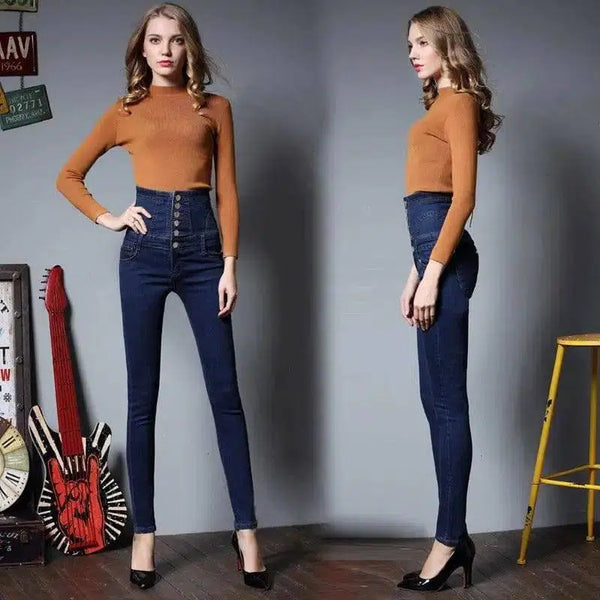 celana jeans berpinggang tinggi wanita celana pensil kaki elastis tipis