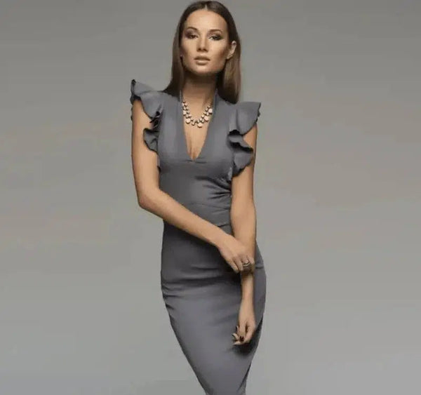 Gaun ketat berlengan daun teratai berleher V yang dalam