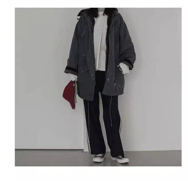 - Kerah: Kerah tinggi dengan tudung serut yang dapat disesuaikan