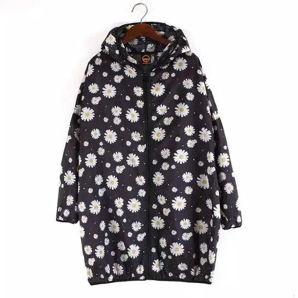 - Motif Bunga Daisy yang Menawan: Jaket ini menampilkan motif bunga daisy yang menyenangkan dan menarik dengan latar belakang gelap, memberikan keseimbangan yang sempurna antara gaya yang berani dan feminin.