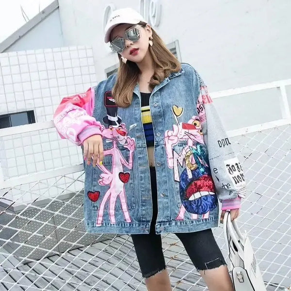 Denim Panjang Tengah dengan Jahitan Motif Payet Macan Tutul Kartun