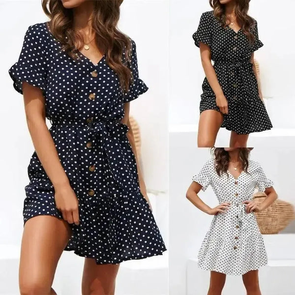 Gaun wanita sifon leher V bertali polkadot bertingkat tinggi yang kasual
