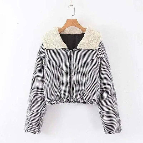 Mantel jaket kotak-kotak pendek berkerah besar berkerudung mantel katun