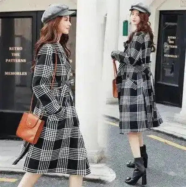 Gaun Midi Kotak-kotak dengan Ikat Pinggang dan Saku
