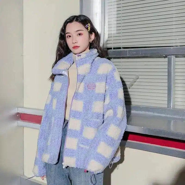 Jaket Cek Wol Hangat Beludru Domba Palsu Wanita