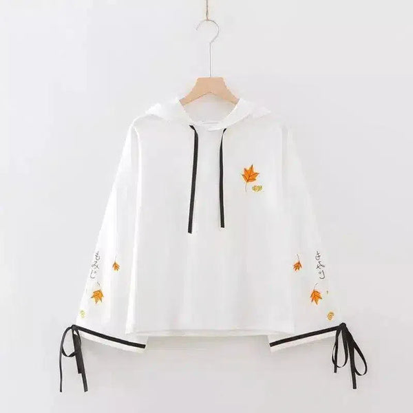 - Detail Desain: Motif Bordir Daun Musim Gugur di Bagian Lengan dan Dada