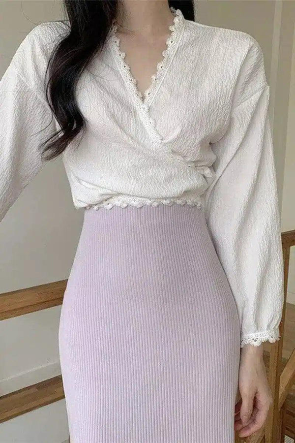 Blus Leher V Berpotongan Renda & Rok Pensil Rajut