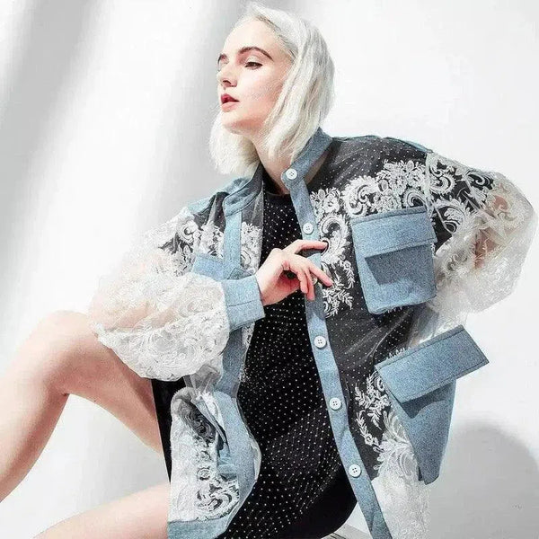 Jaket Denim Lengan Renda untuk Wanita