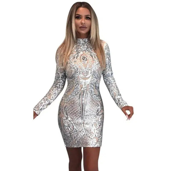 Gaun Pesta Elegan Payet Lengan Panjang Leher Tinggi