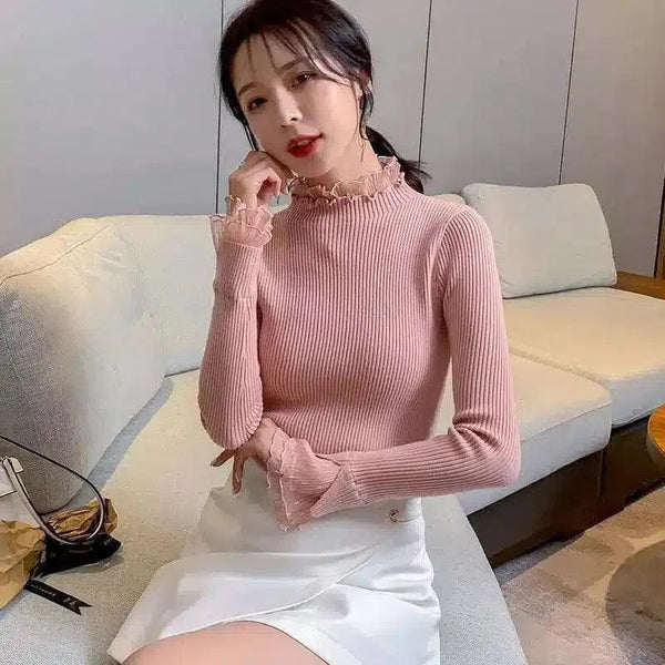 Sweater Kerah Ruffle Kerah Rajut Bergaris Wanita