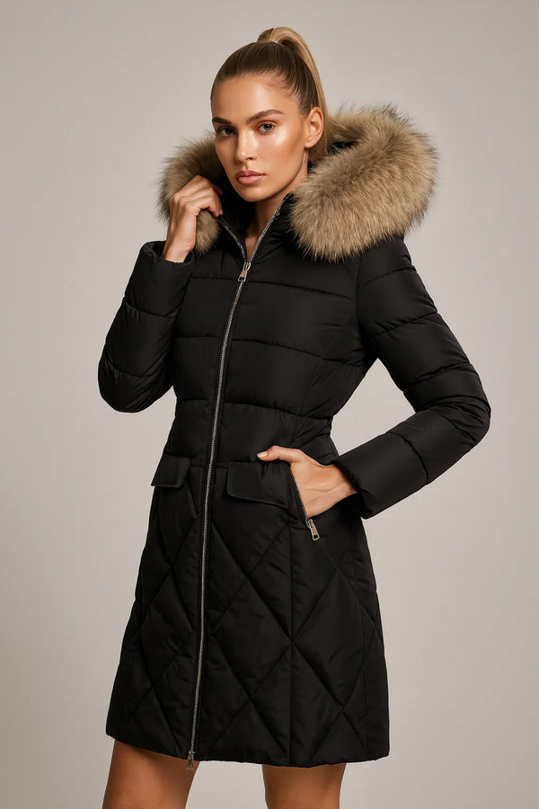 - Gaya Leher/Bahu: Berkerudung dengan Trim Bulu Palsu