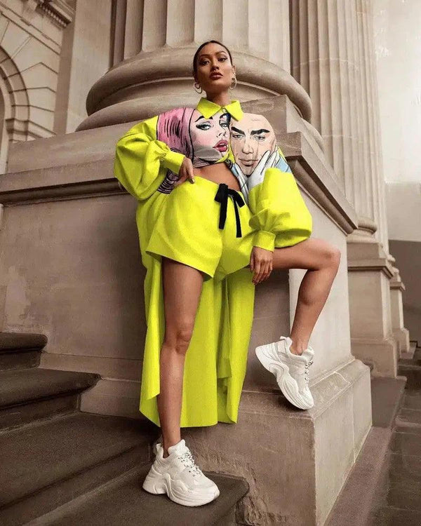 - Detail Tambahan: Desain grafis depan, keliman terbelah yang memanjang menjadi siluet tinggi-rendah