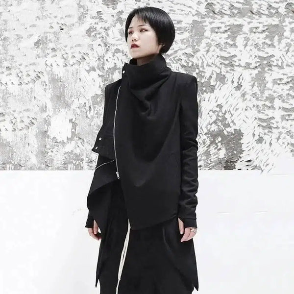 Mantel Tidak Beraturan Ritsleting Hitam Lengan Panjang Turtleneck