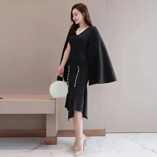 Gaun Cape Wanita Elegan dengan Aksen Mutiara