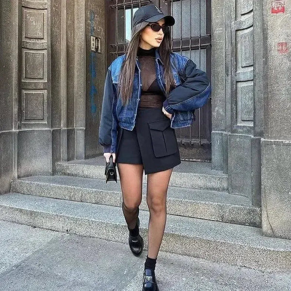 Mantel Jaket Pilot Denim Patchwork Kasual Wanita Mantel Jaket Pilot
