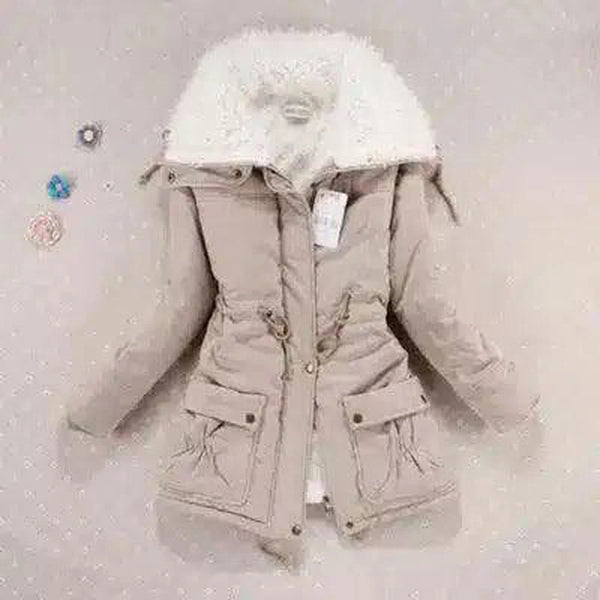 - Kerah Leher: Kerah tinggi dengan trim bulu palsu