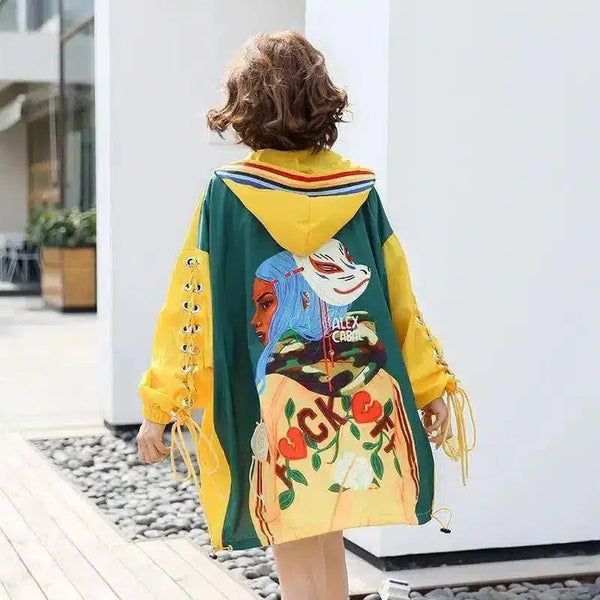 Jaket Berkerudung dengan Cetakan Grafis & Lengan Renda