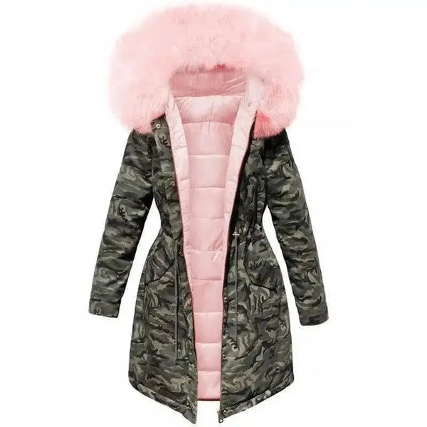 Mantel Tebal Mewah Kerah Bulu Besar Longgar Kamuflase Panjang Tengah